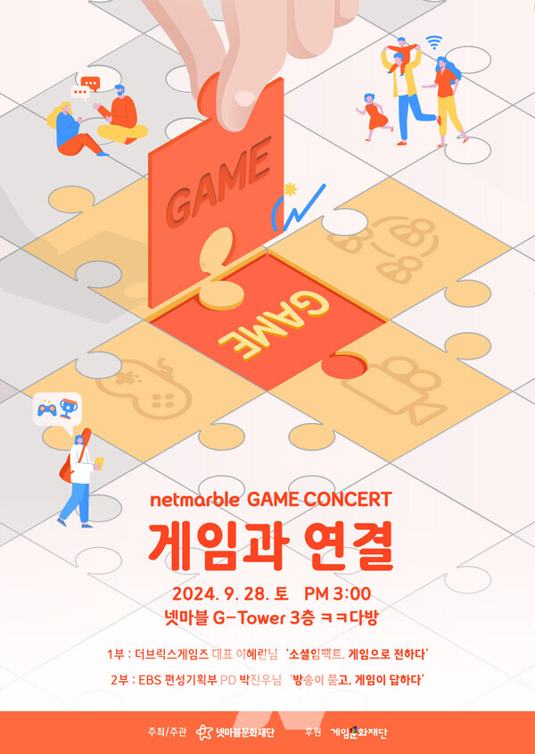 이번 게임콘서트는 9월 28일 오후 3시부터 5시까지 넷마블 사옥에서 개최된다. (주)더브릭스게임즈 이혜린 대표와 EBS 편성기획부 박진우 PD가 각각 ‘소셜임팩트, 게임으로 전하다’, ‘방송이 묻고, 게임이 답하다’를 주제로 강연에 나선다. 게임산업에 관심 있는 사람이라면 누구나 참여가 가능하며, 오는 22일까지 넷마블문화재단 홈페이지 공지사항을 통해 접수할 수 있다. 신청 결과는 별도로 안내된다.