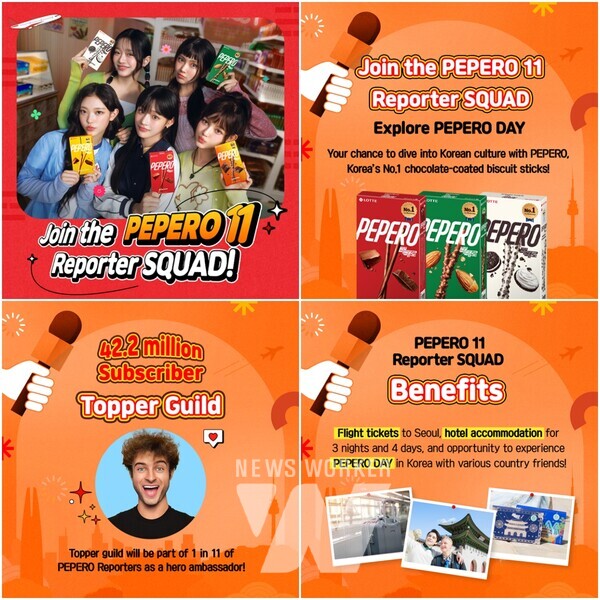 이번 빼빼로 글로벌 리포터는 특히 미국의 크리에이터 토퍼길드(Topper Guild)가 함께한다. 토퍼길드는 빼빼로데이를 소재로 한 기발한 유튜브 영상을 제작해 이를 미국 현지에 알릴 예정이다. 토퍼길드와 함께 할 10명의 국내외 SNS를 운영하는 글로벌 리포터들도 24일까지 모집한다. 지원은 빼빼로 인스타그램에서 프로필 링크를 클릭해 지원 양식을 작성 후 제출하면 된다. 모집 기간 동안 뉴스 형식의 모집 홍보 영상이 미국, 베트남, 인도, 카자흐스탄, 필리핀 등 빼빼로가 수출되는 주요 국가에서 온라인 광고로 방영된다.