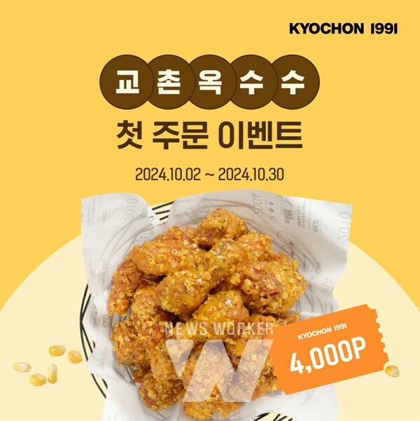 교촌에프앤비㈜가 신메뉴 ‘교촌옥수수’ 홍보를 위해 교촌치킨앱을 통한 첫 주문 이벤트에 돌입했다고 10일 밝혔다. 오는 30일(수)까지 한 달여 간 진행되는 이번 이벤트는 교촌치킨앱의 기존 또는 신규 고객이 ‘교촌옥수수’ 메뉴를 첫 주문하면 다음 주문 시 활용 가능한 4,000포인트를 지급하는 특별 프로모션이다.