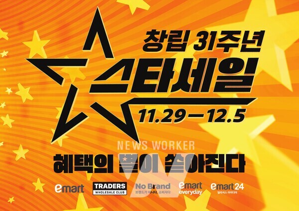 이마트가 이달 말부터 일주일간 ‘창립 31주년 스타세일’을 진행한다. 이번 행사는 이마트, 트레이더스 홀세일 클럽(이하 트레이더스), 이마트에브리데이와 노브랜드, 이마트24가 함께 참여하는 창립 기념 세일로, 오는 11월 29일(금)부터 12/5(목)까지 1주간 이어진다.