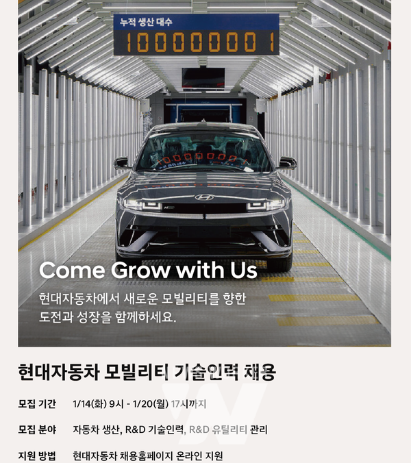 현대차는 “공정하고 투명한 절차 아래 채용을 진행할 계획이다”라며 “다양한 개성과 역량을 가진 인재를 적극적으로 확보할 것”이라고 밝혔다.