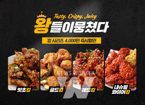 bhc가 자사앱에서 ‘왕의 귀환-킹 시리즈’ 치킨 4,000원 할인 이벤트를 진행하고 있다. 오는 17일까지 진행되는 이번 이벤트는 메뉴명에 ‘킹’이 들어간 bhc 대표 메뉴들을 고객들에게 좀 더 합리적인 가격에 제공하기 위함이다.