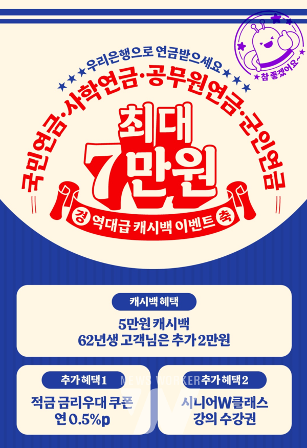 우리은행(은행장 정진완)이 4대연금(국민연금, 공무원연금, 사학연금, 군인연금)을 우리은행 계좌로 받는 고객에게 최대 7만원을 드리는 이벤트를 진행한다고 4일 밝혔다.