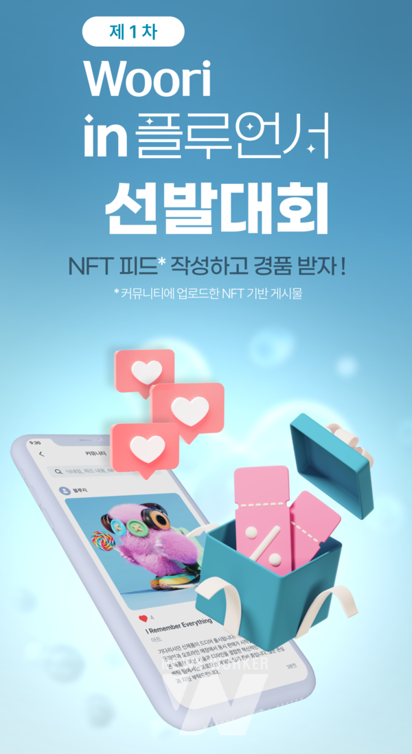 우리은행은 오는 19일까지 NFT 지갑 리뉴얼 오픈을 기념해 ‘좋아요’ 개수가 많은 상위 10명에게 경품을 제공하는 ‘Woori In플루언서 선발대회’를 진행한다. 경품으로는 △갤럭시 워치 울트라 △신세계 상품권을 지급한다. 이벤트 참여는 우리WON뱅킹 앱‘혜택 ▷ NFT피드 작성하고 다양한 경품 받자!’를 클릭해 진행할 수 있다.