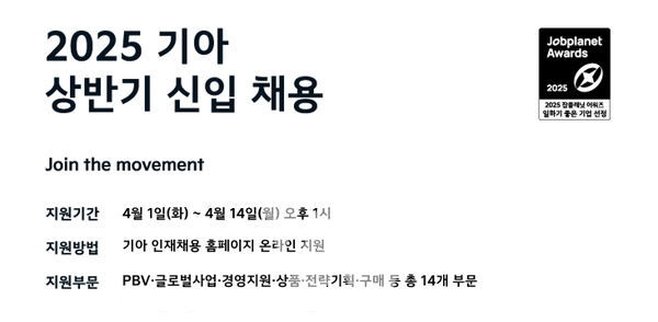 기아가 다음달 1일(화)부터 14일(월)까지 2주 동안 2025년 상반기 대졸 신입사원 채용 지원서를 접수 받는다.