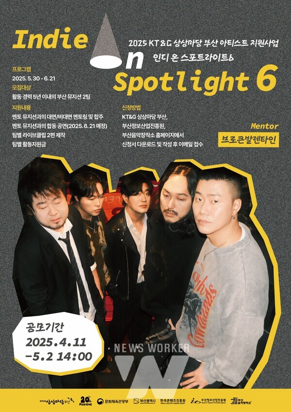 KT&G 상상마당 부산이 지역 신진 뮤지션을 지원하는 ‘인디 온 스포트라이트6’ 프로그램의 참가자를 오는 5월 2일까지 공개 모집한다. 이 프로그램은 부산을 중심으로 활동하는 신예 아티스트들에게 멘토링과 공연 기회를 제공하며 음악 커리어를 본격적으로 시작할 수 있는 발판을 마련해주는 것이 목적이다.