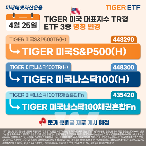 미래에셋자산운용은 TIGER 미국 대표지수 TR형 ETF 3종의 명칭을 변경한다고 25일 밝혔다. 이번 변경은 기획재정부의 2024년 세법개정 후속 시행령에 따른 조치로, TR(토탈리턴)형 해외 ETF인 ‘TIGER 미국S&P500TR(H) ETF’, ‘TIGER 미국나스닥100TR(H) ETF’, ‘TIGER 미국나스닥100TR채권혼합Fn ETF’는 각각 ‘TIGER 미국S&P500(H) ETF’, ‘TIGER 미국나스닥100(H) ETF’, ‘TIGER 미국나스닥100채권혼합Fn ETF’로 명칭이 수정된다.