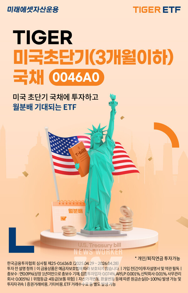 미국 초단기채는 최근 금융시장 변동성 확대 속에서 안정적인 투자처로 주목받고 있다. ‘TIGER 미국초단기(3개월 이하)국채 ETF’는 국내 최초로 미국 초단기 국채에 100% 투자하는 상품으로, 투자 비중은 미국 초단기 국채 30%, 미국 초단기 국채 ETF 70%로 구성된다. 듀레이션은 약 0.12년 수준으로 금리 등락에 따른 리스크를 최소화하고, 연 0.09% 수준의 낮은 총보수로 안정적인 이자 수익을 추구할 수 있다.