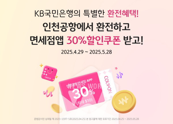 KB국민은행은 인천국제공항공사와 마케팅 제휴를 맺고 ‘인천공항에서 환전하고! 면세점앱 30% 할인쿠폰 받고!’ 이벤트를 5월 28일까지 진행한다고 밝혔다. 이번 이벤트는 인천공항 내 KB국민은행 영업점 또는 출국장 환전소에서 대면 방식으로 100만 원 이상의 원화를 외화로 환전한 고객을 대상으로 하며, 선착순 3,000명에게 인천공항공사의 공식 앱인 '인천공항면세점'에서 사용할 수 있는 30% 할인 쿠폰이 지급된다. 해당 쿠폰은 최대 10달러까지 할인 가능하다.