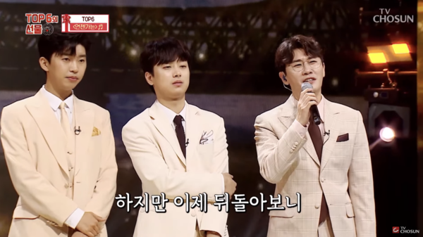 당시 무대는 맏형 장민호가 선창했다. 장민호의 감미로운 첫 소절에 이어 영탁이 마이크를 이어받아 노래를 계속했다. 임영웅의 담담한 목소리 뒤로 김희재의 아련한 보컬이 들려왔다.