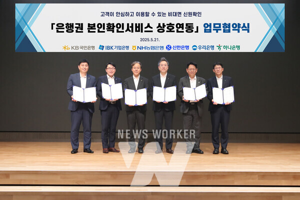 KB국민은행은 지난 21일 IBK기업은행, NH농협은행, 신한은행, 우리은행, 하나은행과 함께 ‘은행권 본인확인서비스 상호연동 업무협약’을 체결했다. 이번 협약식은 우리은행 본점에서 열렸으며, 각 은행 관계자들이 참석해 협력 의지를 다졌다.
