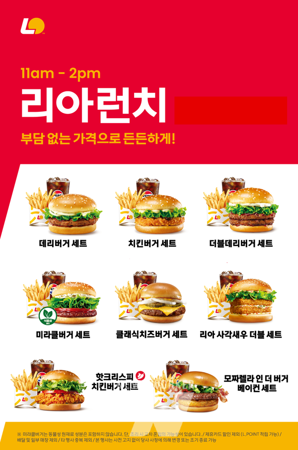 지난 2월 롯데리아는 자사 앱 ‘롯데잇츠’ 회원 중 ‘리아런치’를 구매한 고객을 대상으로 설문조사를 진행했으며, 조사 결과 기존 ‘리아런치’ 메뉴에 포함되지 않았던 ‘모짜렐라 인 더 버거 베이컨’, ‘클래식 치즈버거’, ‘더블데리 버거’가 높은 선호도를 기록했다. 점심 메뉴와 장소 선택 시 가장 중요한 요소로 가격을 꼽은 응답자는 44.2%였으며, 이 중 6천원에서 7천원대 가격대를 선호하는 비율은 약 38%에 달했다.