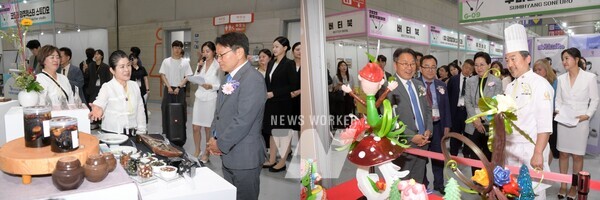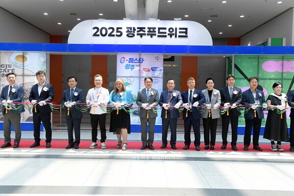 강기정 광주광역시장이 29일 오전 김대중컨벤션센터에서 열린 2025 광주식품대전 개막식에 참석해 참석자들과 함께 개막 테이프 커팅을 하고 있다.