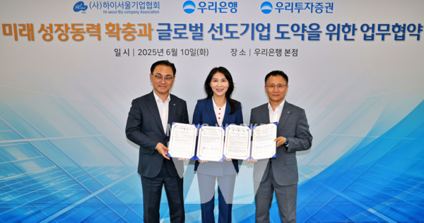 우리은행은 지난 10일 우리투자증권, 하이서울기업협회와 함께 ‘미래 성장 동력 확충과 글로벌 선도기업 도약을 위한 업무협약’을 체결했다고 밝혔다. 이번 협약은 우리은행 본점에서 개최됐으며, 배연수 우리은행 기업그룹장, 남기천 우리투자증권 대표, 박미경 하이서울기업협회장 등 주요 관계자들이 참석했다.