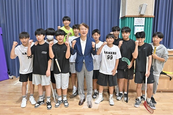 김이강 광주 서구청장이 22일 서구 상무국민체육센터 다목적체육관에서 열린 ‘제6회 서구청장배 생활체육 플로어볼대회 개회식’에서 참석자들과 기념촬영을 하고 있다.