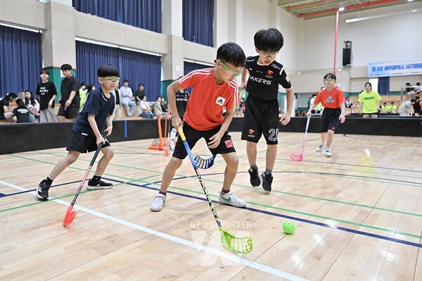 제6회 광주 서구청장배 생활체육 플로어볼대회 참가자들이 22일 서구 상무국민체육센터 다목적체육관에서 경기를 펼치고 있다. 광주 서구 제공