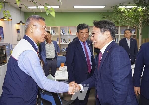 강기정 광주광역시장이 26일 오후 하남혁신지원센터에서 열린 '민주노총 광주본부 사무실 개소식'에 참석해 이종욱 본부장과 인사를 나누고 있다./광주광역시 제공
