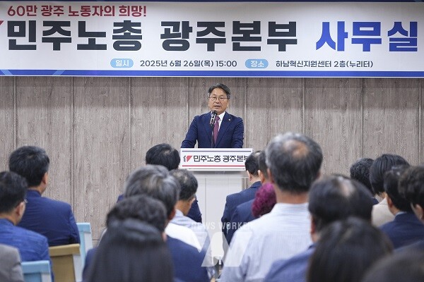 강기정 광주광역시장이 26일 오후 하남혁신지원센터에서 열린 '민주노총 광주본부 사무실 개소식'에 참석해 격려사를 하고 있다./광주광역시 제공