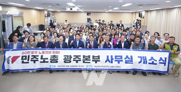 강기정 광주광역시장이 26일 오후 하남혁신지원센터에서 열린 '민주노총 광주본부 사무실 개소식'에 참석해 이종욱 본부장 등 내빈들과 기념촬영을 하고 있다./광주광역시 제공