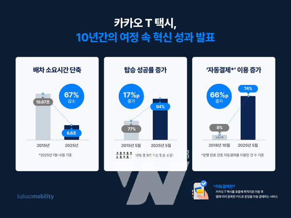 카카오모빌리티가 택시 호출 서비스 10주년을 맞아 ‘카카오 T’ 플랫폼을 통해 택시 이용 방식 혁신 성과를 공개했다. 카카오 T 앱 데이터 분석 결과, 택시 호출 후 배차까지 평균 소요 시간은 서비스 초기 대비 약 67% 단축되어 올해 상반기 기준 6.6초에 불과하며, 탑승 성공률은 94%까지 올라 사용자 편의가 크게 개선된 것으로 나타났다. 특히 2019년 도입된 승차거부 없는 가맹택시 서비스는 단거리 및 비선호 지역 호출 수요 대응에 효과적이었다.
