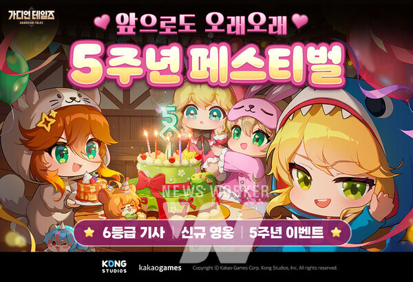 ㈜카카오게임즈는 미국 개발사 콩 스튜디오가 개발한 모바일 RPG ‘가디언 테일즈’ 서비스 5주년을 맞아 대규모 업데이트를 진행했다고 11일 밝혔다. 이번 업데이트에는 5주년 기념 카드와 코스튬 선물, 신규 영웅 ‘크루시엘’ 추가, 메모리얼 단편집 공개 등 다양한 콘텐츠가 포함됐다.