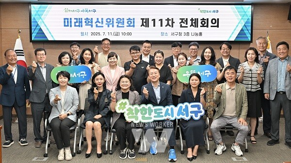 이어 김 청장은 ‘미래혁신위원회 제11차 전체회의’에서 위촉장을 수여한 후 참석자들과 기념촬영을 하고 있다. 광주 서구 제공