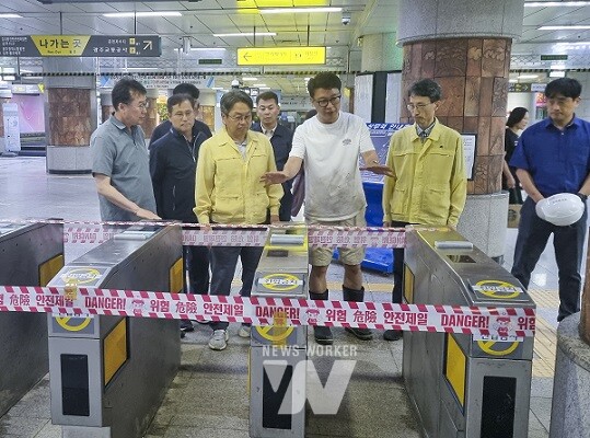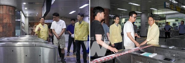강기정 광주광역시장이 18일 오전 폭우로 침수 피해를 입은 광주지하철 1호선 상무역을 찾아 피해 복구 상황을 점검하고 있다. 긴급 복구를 마친 광주지하철은 전 구간 정상운행에 들어갔다./광주광역시 제공