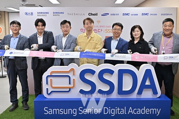 김이강 광주 서구청장이 21일 서구 서빛마루시니어센터에서 열린 '삼성 시니어 디지털아카데미 체험센터 개소식'에서 참석자들과 테이프 커팅식을 갖고 있다.