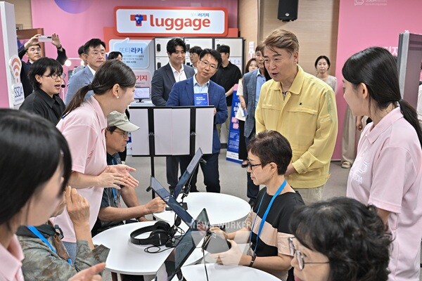 김이강 광주 서구청장이 21일 서구 서빛마루시니어센터에서 열린 '삼성 시니어 디지털아카데미 체험센터 개소식'에서 참석자들과 실습존, 리빙랩존, 커뮤니티존 등 체험센터 내부를 둘러보고 있다.
