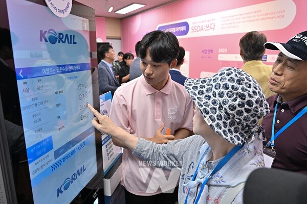 광주시 서구 서빛마루시니어센터 이용 어르신들이 21일 서구 서빛마루시니어센터에서 열린 '삼성 시니어 디지털아카데미 체험센터 개소식'에서 키오스크 사용 방법 등을 체험하고 있다. /광주 서구 제공