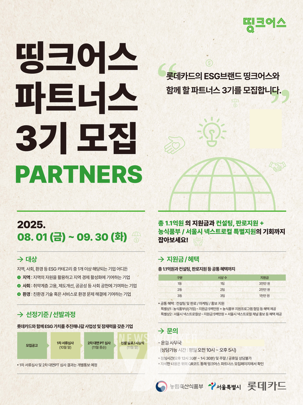롯데카드가 ESG 경영을 실천하는 중소기업을 발굴·지원하는 ‘띵크어스 파트너스 3기’ 참여 기업을 오는 8월 1일부터 9월 30일까지 공개 모집한다. 해당 프로그램은 지역사회, 환경, 사회적 가치 실현에 기여하는 기업을 대상으로 하며, 롯데카드는 이를 통해 지속가능한 성장을 추구하는 기업들과의 협업을 확대할 계획이다.
