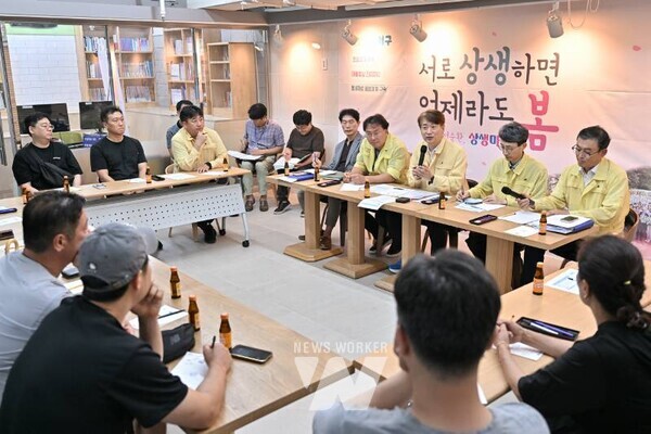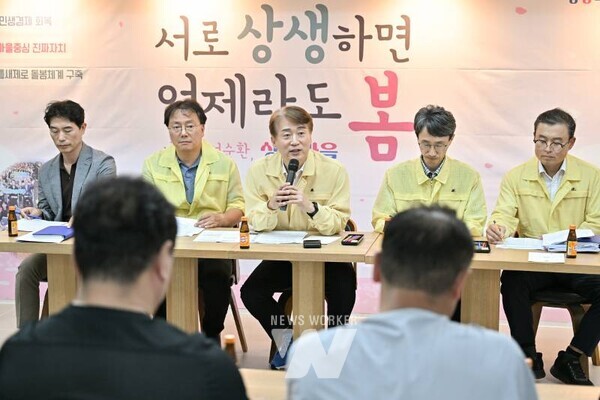 김이강 광주 서구청장이 31일 서구 금호1동 행정복지센터에서 열린 '도시철도 2호선 1구간 공사 관련 광주시-주민 간담회'에서 상인들의 피해현황과 안전대책 등에 대한 의견을 듣고 있다. /광주 서구 제공