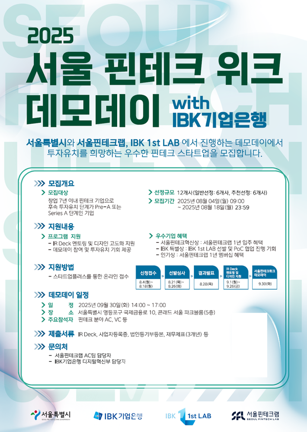 IBK기업은행은 오는 9월 30일 여의도 콘래드 서울에서 열리는 ‘2025 서울 핀테크 위크 데모데이 with IBK기업은행’에 참여할 핀테크 기업을 모집한다고 밝혔다. 이번 데모데이는 유망 핀테크 스타트업을 발굴하고, 이들의 투자 유치 및 홍보를 지원하기 위해 마련된 행사다.