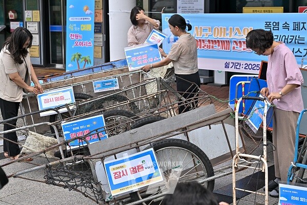 광주 서구(구청장 김이강) 착한동행팀 직원들이 6일 서구청 야외광장에서 폐지수집 어르신들이 맡긴 리어카를 보관 및 정리하고 있다.