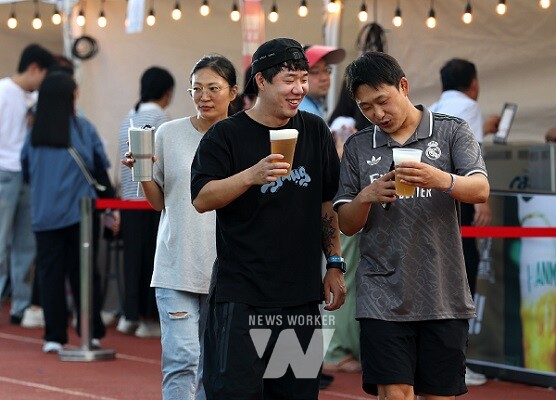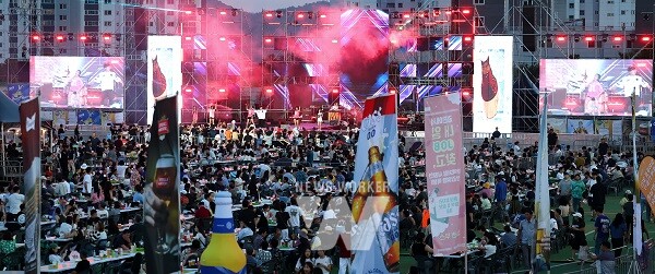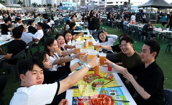 제3회 강진하맥축제가 28일 강진종합운동장에서 열린 가운데 관광객들이 맥주를 들이키며 축제를 즐기고 있다.