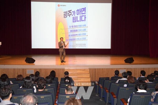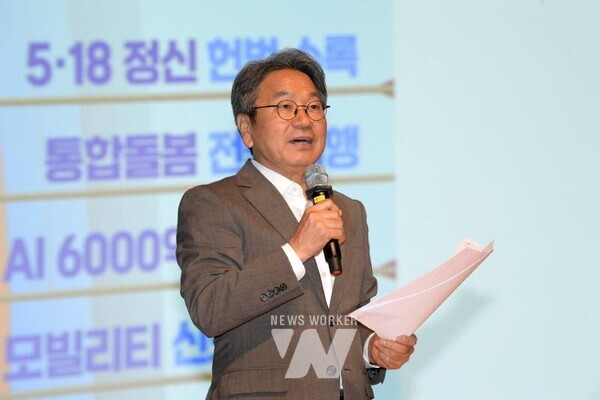 강기정 광주광역시장이 3일 시청 대회의실에서 열린 9월 정례조회에 참석해 5·18정신 헌법전문 수록, 광주다움 통합돌봄 전국화, 인공지능 2단계 사업인 AX실증밸리 조성사업, AI 모빌리티 신도시 조성 등 이재명 정부 국정과제에 반영된 광주시의 성과들을 설명하며, 그간 노력해온 공직자들을 격려하고 있다./ 광주광역시 제공