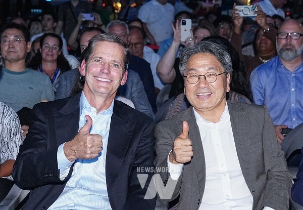강기정 광주광역시장이 3일 오후 동구 금남로 일원에서 열린 세계양궁선수권대회 개막 오프닝 쇼 ‘활의 나라’ 행사에 참석해 세계양궁연맹(WA) 제10대 회장으로 선출된 그레그 이스턴 신임 회장과 엄지를 들어보이고 있다.