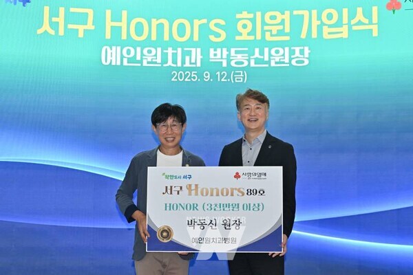 광주 서구(구청장 김이강)는 12일 서구청 1층 기부자 명예의 전당에서 예인원 치과병원 박동신 대표원장의 서구아너스 회원 가입식을 가졌다. /광주 서구 제공