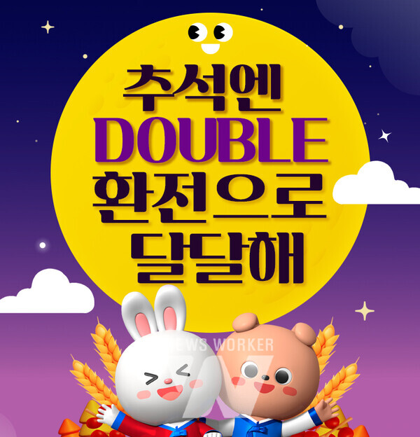 우리은행(은행장 정진완)은 추석 연휴 기간 해외여행객을 대상으로 9월 19일부터 10월 12일까지 환전 이벤트 ‘추석엔 DOUBLE 환전으로 달달해’를 진행한다고 밝혔다.