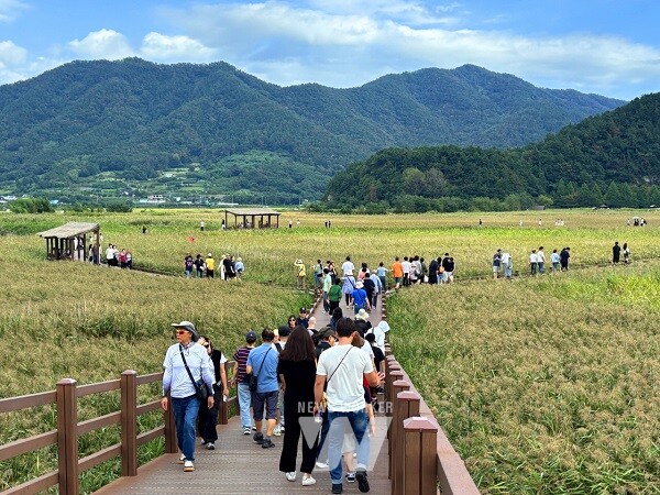 추석 연휴 순천만습지를 찾은 방문객들이 가을 정취 속에서 갈대밭 산책을 즐기고 있다.