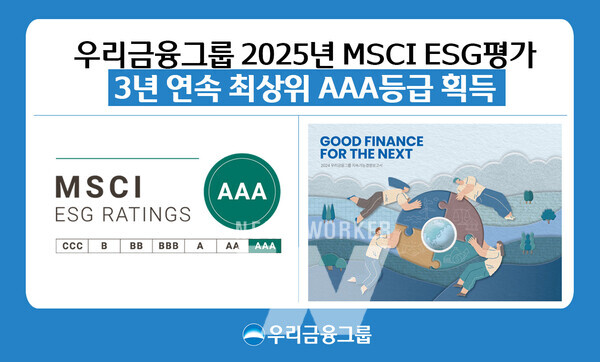 우리금융그룹(회장 임종룡)은 16일 세계적인 투자정보 기관 모건스탠리캐피털인터내셔널(MSCI)이 실시한 2025년도 ESG 평가에서 3년 연속 최상위 등급인 AAA를 획득했다고 밝혔다.