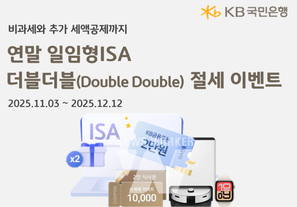 KB국민은행(은행장 이환주)이 연말을 맞아 오는 12월 12일까지 절세상품 가입 고객을 대상으로 ‘연말 일임형ISA 더블더블(Double Double) 절세 이벤트’를 진행한다. 이번 이벤트는 일임형ISA와 연금저축펀드 신규 가입 또는 추가 입금 고객을 대상으로 하며, 경품 추첨과 KB금융쿠폰 지급 혜택을 제공한다.