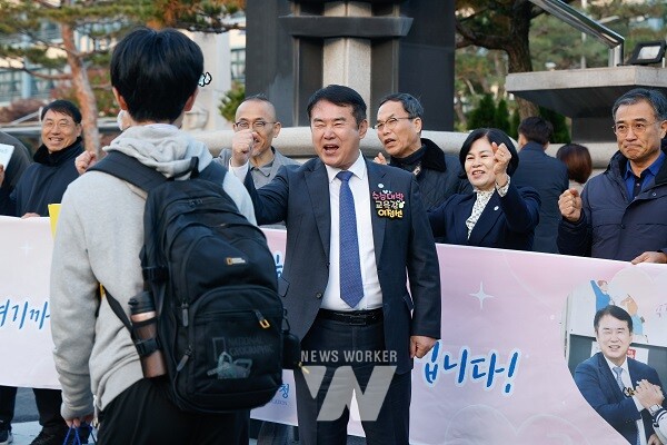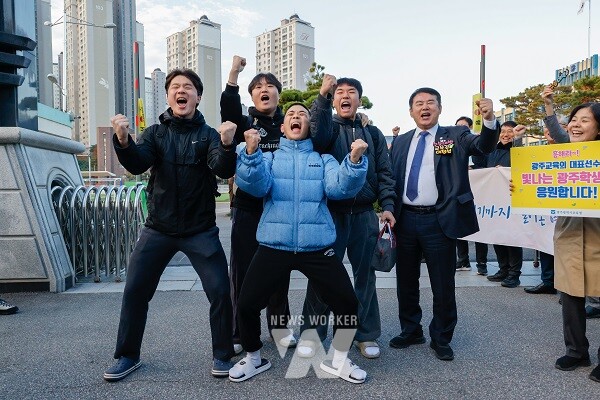 이정선 광주시교육감은 대학수학능력시험이 치러지는 13일 광주광역시교육청 26지구 제21시험장인 광주 서구 서석고등학교 앞에서 시험장으로 들어가는 수험생들을 격려했다.