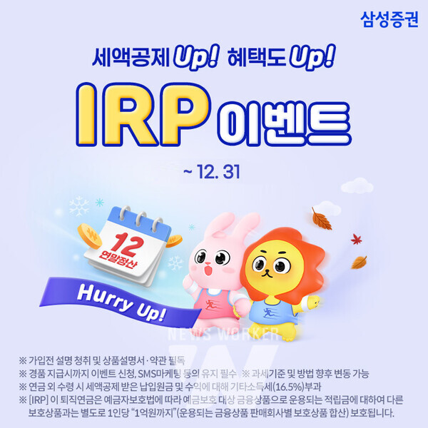 삼성증권은 ‘세액공제 Up 혜택도 Up Hurry Up! IRP 이벤트’를 오는 12월 31일까지 진행한다고 밝혔다. IRP 계좌는 노후 대비와 절세 혜택을 동시에 제공하는 개인형 퇴직연금 계좌로 세액공제 한도가 커 매년 관심이 높은 상품이다. IRP는 연간 1,800만원까지 납입할 수 있으며 연금저축과 합산해 최대 900만원 한도로 세액공제를 받을 수 있다. 또한 ISA 만기 자금을 IRP로 이체하면 이체 금액의 10%와 합산해 최대 1,200만원까지 공제 혜택을 적용받을 수 있다.