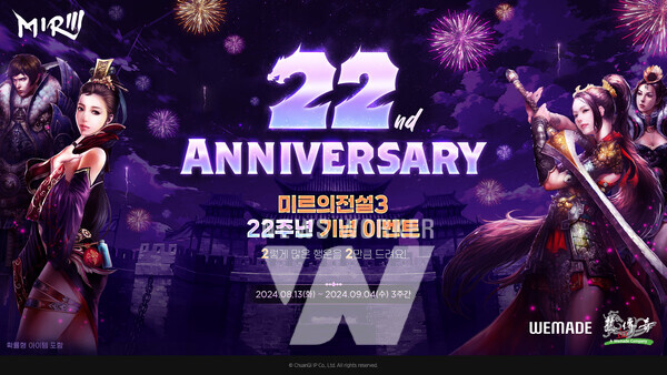 ㈜위메이드(대표 박관호)의 자회사 전기아이피에서 서비스 중인 MMORPG "미르의 전설3"가 서비스 22주년 기념 이벤트를 오늘(13일)부터 9월 4일(수)까지 진행한다.