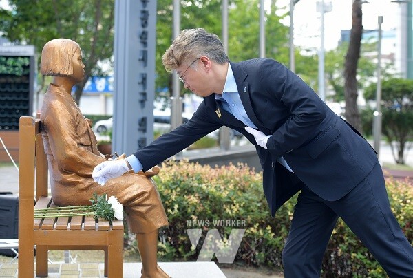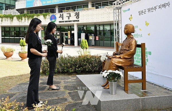 광주 서구(구청장 김이강)는 8월 14일 일본군 '위안부' 피해자 기림의 날을 맞아 서구청 광장 '평화의 소녀상' 앞에 기념공간을 마련해 시민 누구나 이날을 기억하고 헌화.묵념할 수 있도록 했다.