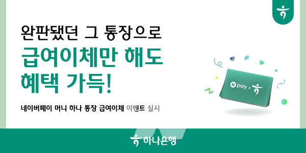 하나은행(은행장 이승열)은 네이버페이(대표이사 박상진)와 함께 "네이버페이 머니 하나 통장" 급여이체 이벤트를 실시한다고 밝혔다.