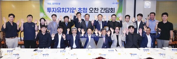 강기정 광주광역시장이 ‘국회, 광주의 날’ 둘째날인 3일 서울 국회 앞 식당에서 투자유치기업 초청 간담회를 갖고 기업체 대표들과 AI 투자유치 활성화 방안을 논의한 뒤 기념촬영을 하고 있다./광주광역시 제공
