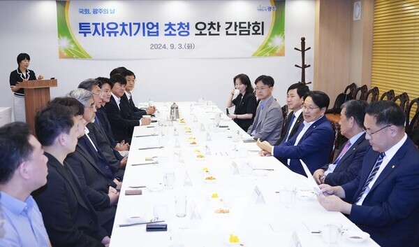 강기정 광주광역시장이 ‘국회, 광주의 날’ 둘째날인 3일 서울 국회 앞 식당에서 투자유치기업 초청 간담회를 갖고 기업체 대표들과 AI 투자유치 활성화 방안을 논의하고 있다.