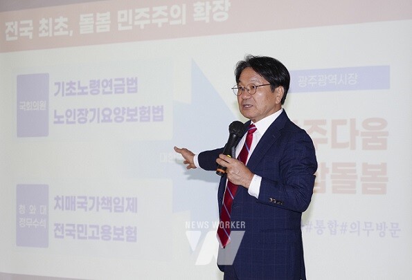 강기정 광주광역시장이 24일 오후 서구 광주노인회관에서 열린 ‘경로당지도자교육’에서 광주다움 통합돌봄 등 시정 주요현안에 대한 정책간담회를 진행했다.